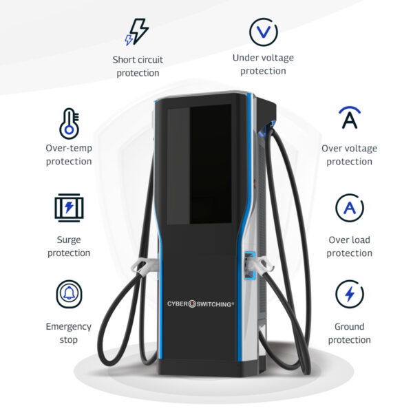 The CyberSwitching CSDC Series offers a powerful, scalable DC Fast Charging (DCFC) solution tailored for commercial and fleet applications. Available with one or two charging outlets, it delivers output power ranging from 120 kW up to 240 kW, with future provisions for upgradeability to 320 kW. This high-performance charger can refuel most electric vehicles to 80% state‑of‑charge in less than 30 minutes, making it ideal for highway rest stops, fuel stations, shopping centers, and busy fleet depots.